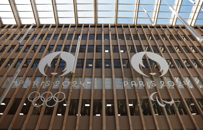 Les logos des Jeux olympiques et paralympiques de Paris 2024 sont représentés sur le bâtiment du siège du comité d’organisation.