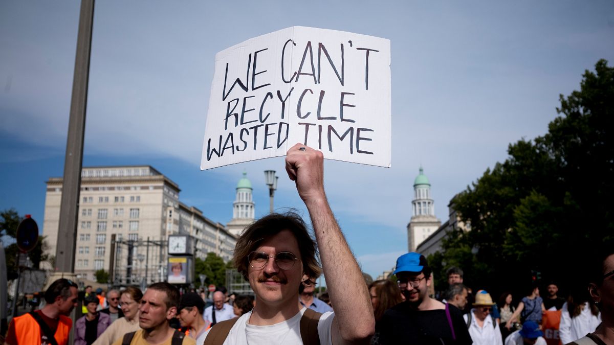 A man attends a climate protest in Berlin, Germany.