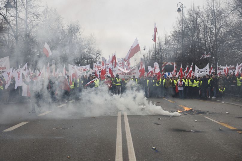 Les agriculteurs et chasseurs polonais et leurs partisans manifestent à Varsovie, en Pologne, le mercredi 6 mars 2024.