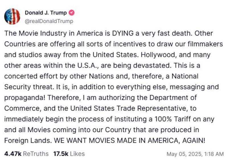 Tard hier soir, le président s’est rendu sur la plate-forme sociale Truth pour partager une mise à jour sur l’impact tarifaire sur l’industrie cinématographique.