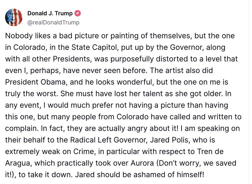 Dans un article récent sur sa plate-forme sociale Truth, Trump a partagé une photo du portrait, disant que c’est « vraiment le pire » et le blâmer sur « le gouverneur de gauche radical du Colorado, Jared Polis ».