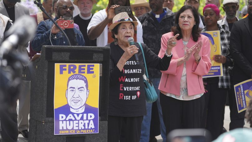 Divers dirigeants syndicaux de toute la Californie ont mené la foule dans des chants d’appel à sa libération. Huerta a ensuite été publié sous une caution de 50 000 $ (43 777 €).