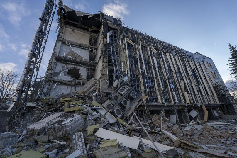 L'hôtel de ville est vu endommagé après une attaque de fusée russe qui a tué et blessé un certain nombre de personnes à Izium, Ukraine, mardi 4 février 2025. (AP Photo / Andrii Marienko)