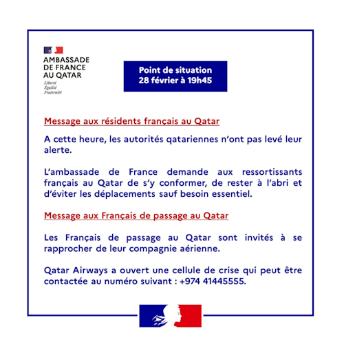 French citizens travelling in Qatar are advised to contact their airline. Qatar Airways has opened a crisis centre, which can be contacted at the following number: +974 41445555. »