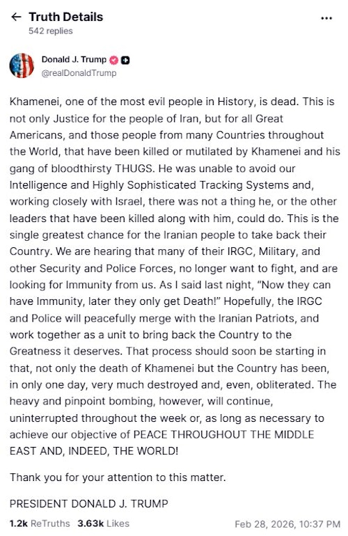 Various media reported that Iran’s Supreme Leader Ayatollah Ali Khamenei was killed and his body has been found. Neither Iran nor the United States have confirmed.