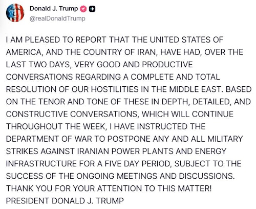 « Based on the tenor and tone » of the talks, « which will continue throughout the week, » Trump instructed the Department of Defence « to postpone any and all military strikes against Iranian power plants and energy infrastructure for a five day period, subject to the success of the ongoing meetings, » he added.