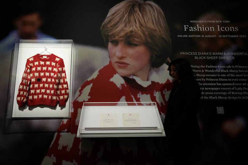 Un pull en laine à motifs rouges avec un seul mouton noir parmi un motif de moutons blancs porté par la jeune princesse Diana sera en tête d’affiche de la vente en ligne Fashion Icons de Sotheby’s en septembre.