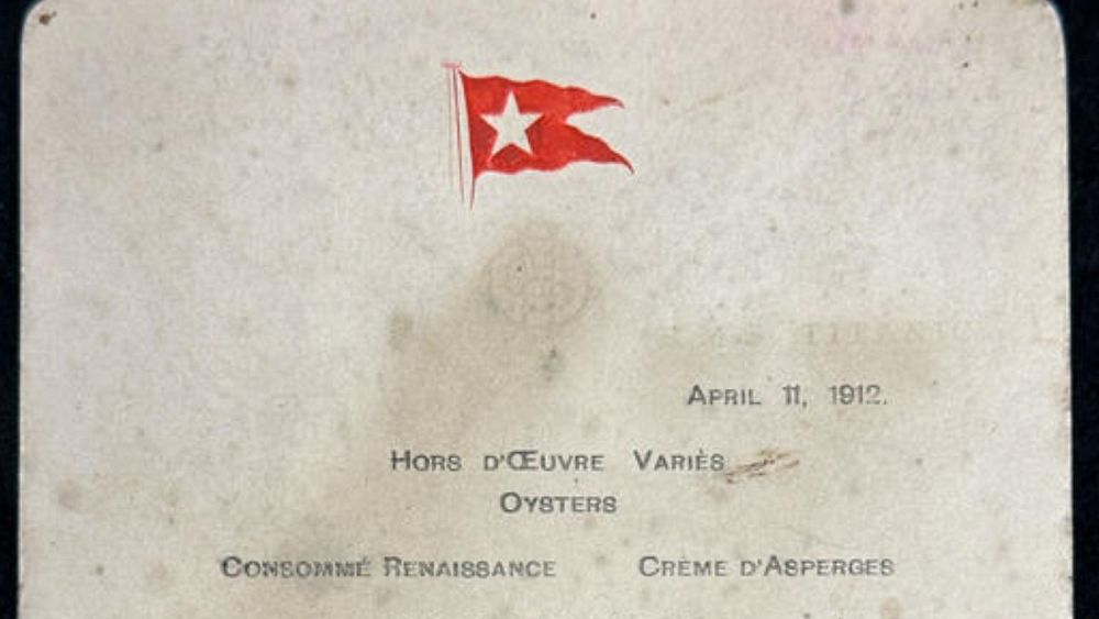 Le menu récupéré et fortement taché d’eau détaille le premier dîner à bord après le départ du Titanic de Queenstown, Belfast, et révèle l’opulence qu’auraient connu les passagers de première classe du navire.