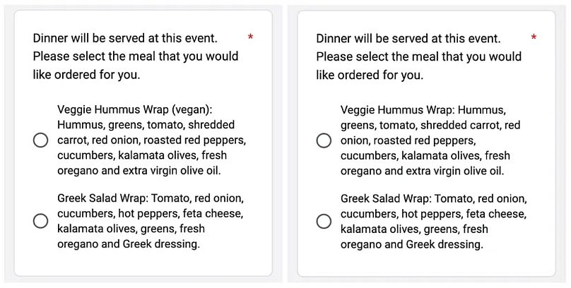Une version – montrée à la moitié des sujets testés – avait une étiquette « végétalienne » sur l’une des options de repas tandis que l’autre – montrée au groupe restant – n’en avait pas.