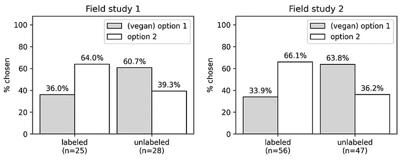 Encore une fois, cette fois via une étude en ligne, les consommateurs américains étaient beaucoup moins susceptibles de choisir une option lorsqu’elle portait une étiquette « végétalienne » ou « végétarienne » et avaient beaucoup moins de scrupules lorsque les étiquettes étaient exclues.