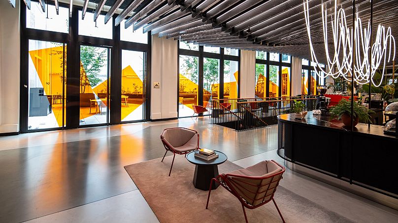 Le bâtiment, dont le thème ressemble à du matériel, avec une palette de couleurs en grande partie noire qui contraste avec la lumière vive provenant des fenêtres massives, présente également une gamme d’œuvres d’art NFT originales et ce qu’il appelle de l’art génératif sur les murs. comme café branché et bistro français.