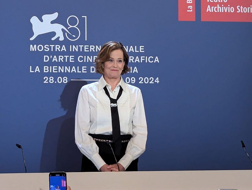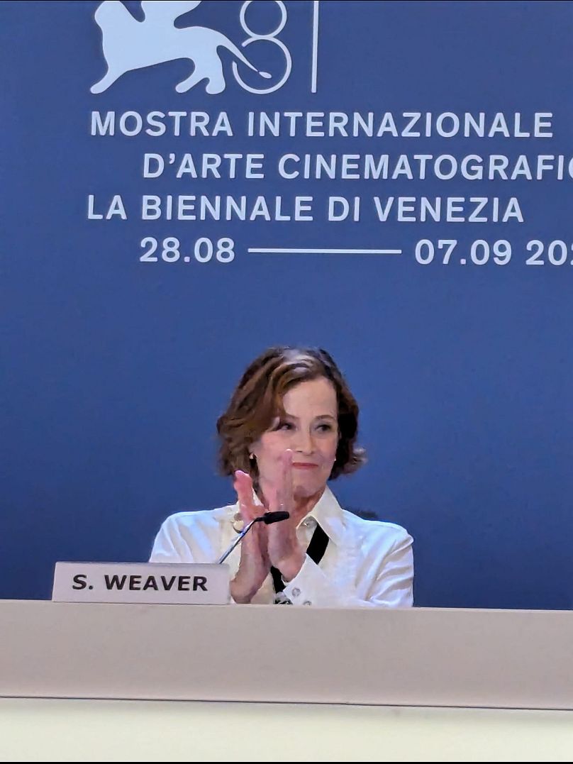 Mieux connu pour les franchises Alien et Avatar, ainsi que pour ses rôles dans Gorilles dans la brume, Fille qui travaille et La tempête de verglasWeaver s’est présenté à la conférence de presse de Venise de bonne humeur, vêtu d’une combinaison chemise blanche/cravate noire sans effort et élégante.