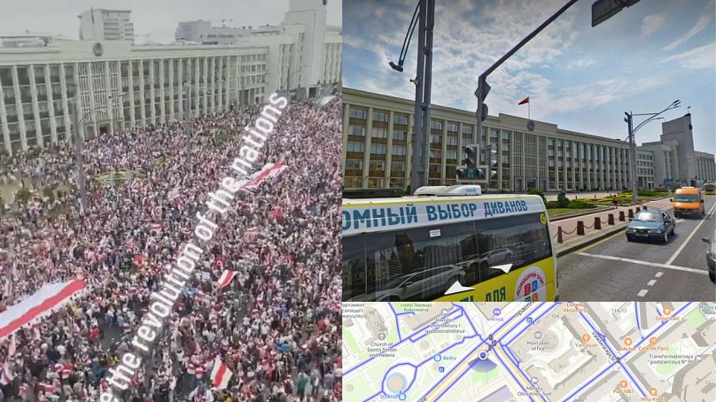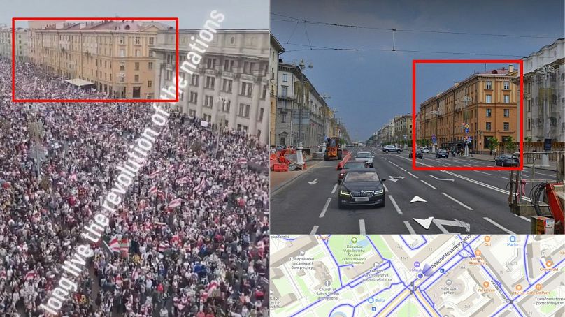 Grâce à la recherche d’images inversées, il est possible d’identifier la rue de l’Indépendance de Minsk, ainsi que la place de l’Indépendance, pendant que la caméra se déplace dans la vidéo.