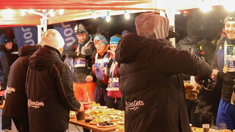 Médailles en bois et sacs cadeaux à la main, nous avons rejoint nos collègues coureurs pour la nourriture et les prix à Les Gets Force Hall et l’espace événementiel. Le dîner a été inclus dans le prix d’entrée de la course de 35 €, l’équipage de soutien non participant bienvenu pour nous rejoindre.