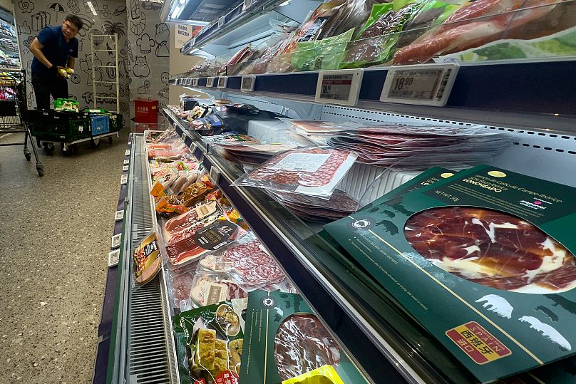 Un travailleur réapprovisionne les articles près des produits de porc importés d’Espagne dans un supermarché à Pékin, 18 juin 2024