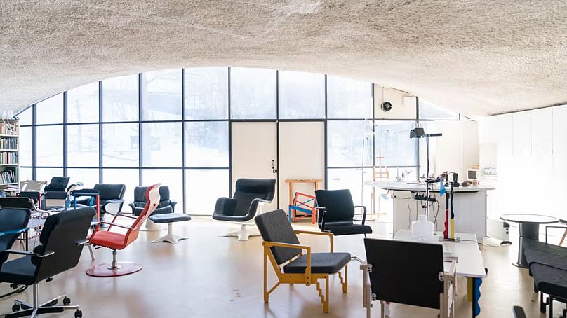 Kukkapuro a conçu le studio et la maison de sa famille pour présenter un toit en forme de vague et des fenêtres en verre du sol au plafond. Construit à la fin des années 1960 pour lui et son épouse, l’artiste Irmeli Kukkapuro, décédé en 2022, il devrait devenir musée l’année prochaine.